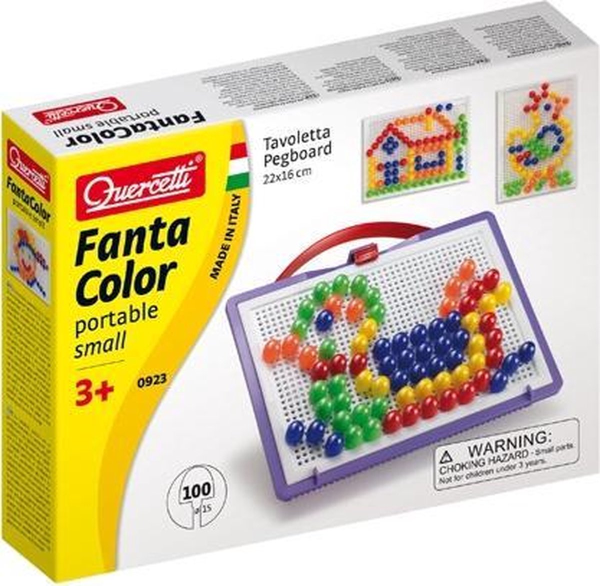 Fantacolor is een tijdloos spel dat kinderen al generaties lang spelen. Plaats de pinnen in het bord voor mooie mozaieken. Maak je eigen afbeelding of maak ?©?©n van de voorbeelden na. Alle onderdelen kun je opbergen in de koffer, waardoor je de Fanta Color eenvoudigop kunt ruimen en mee kunt nemen. Door het handvat kun je de koffer niet alleen makkelijk meenemen, ook kun je je mozaiek hieraan ophangen.
