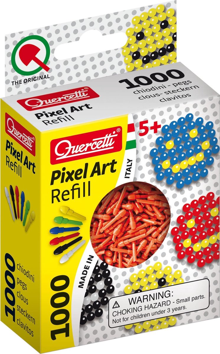 Quercetti Pixel Art aanvuldoos Zijn jouw rode pinnen op? Met deze aanvuldoos van 1000 rode pinnen heb je er weer genoeg. De pinnen hebben een diameter van 4 mm en zijn gemaakt voor de Pixel Art serie van Quercetti. Specificaties: Diameter pinnen: 4 mm Materiaal: kunststof Kleur: rood Geschikt voor kinderen vanaf 5 jaar.