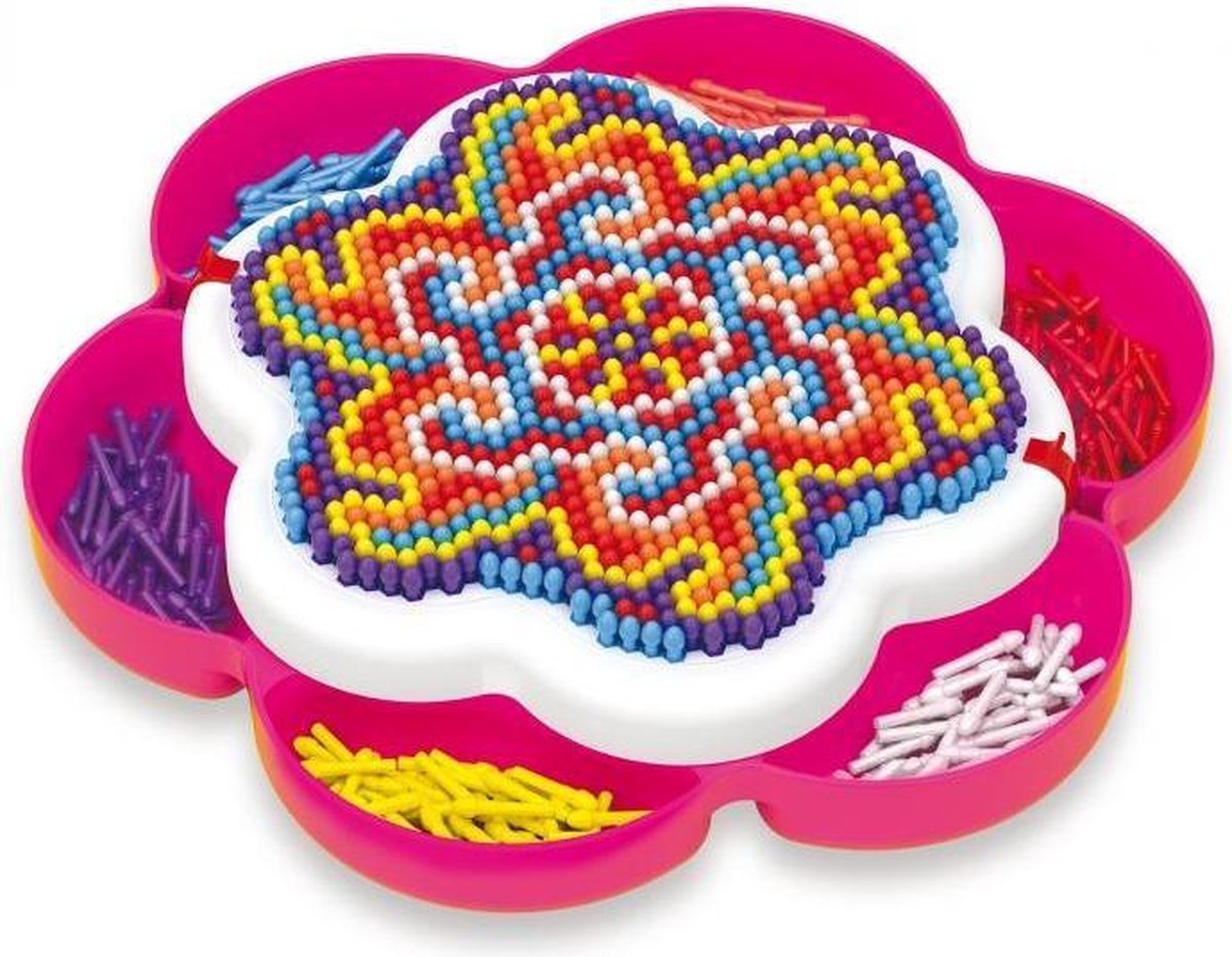 Quercetti Pixel Mandala Ontwerp de mooiste mandala's door de kleurrijke pinnen op de juiste plek in het bord te drukken. Kinderen ontwikkelen hiermee hun oog-handcoördinatie en het herkennen van kleuren. Volg de ontwerpen uit het voorbeeldboek of laat jouw fantasie het werk doen. Specificaties: Afmetingen verpakking: 29 x 29 x 7 cm Diameter pinnen: 5 mm Materiaal: kunststof Geschikt voor kinderen vanaf 5 jaar. Inhoud: 6 Ontwerpen 1 Insteekbord met sorteerbakjes 1200 Pinnen