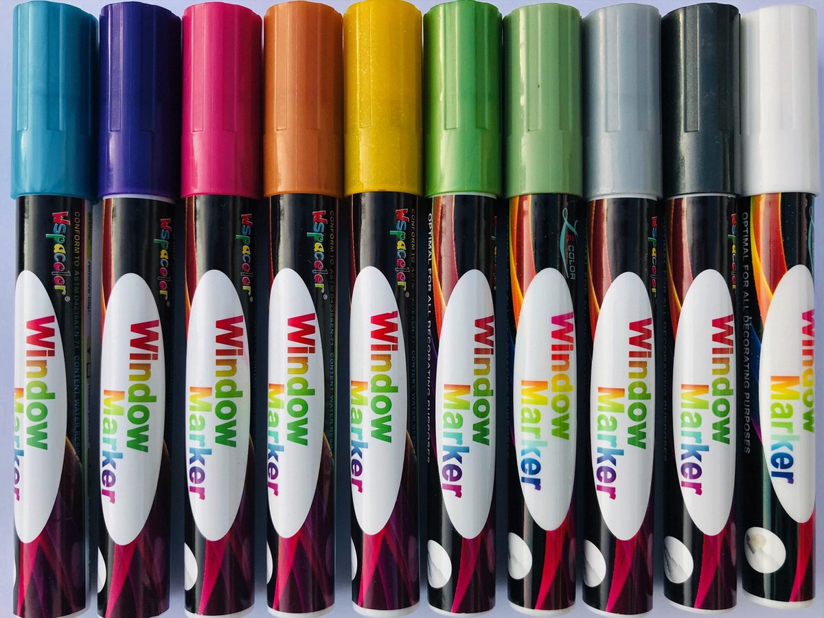 10 kleuren raamstiften waarmee je mooie tekeningen of teksten kan maken op ramen of krijtborden. Verpakt in een luxe papieren doosje, extra leuk om cadeau te geven! Deze set bevat stiften met een metallic look, waardoor ze iets meer glanzen dan de normale set. Leuk voor thuis op kantoor of voor bijvoorbeeld horeca. Op Pinterest vind je de mooiste voorbeelden die je kan printen, op het raam plakt en overtrekt. Ook leuk als versiering voor een verjaardag, sinterklaas of kerst. Elke marker heeft een ronde en een platte punt, de punt kan je er eenvoudig uithalen en omdraaien. Tips voor het gebruik: druk de punt zachtjes een keer in om de druk te verminderen. Schud vervolgens 30 seconden. Druk daarna een aantal seconden de punt in totdat deze volgelopen is met verf. Voor het verwijderen van de tekeningen adviseren wij dit met een droge doek te doen. Inclusief goud, zilver, zwart en wit!