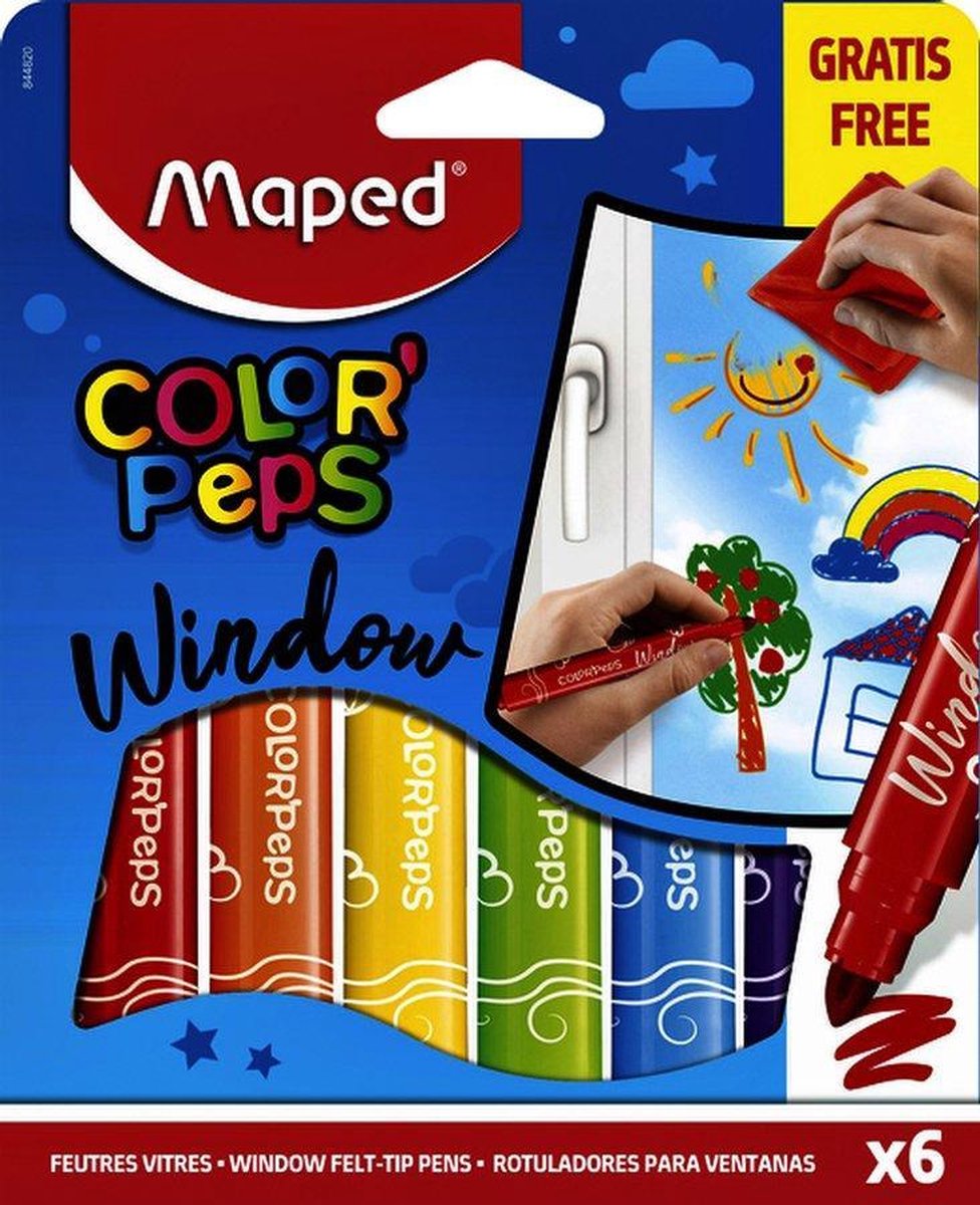 6 kleuren met gratis schoonmaakdoekje Kleurviltstiften Window - ramen als oppervlak om te kleuren. Bruikbaar op allerlei soorten glas. Grote diameter voor een betere grip. Gemakkelijk schoon te maken met een natte microvezeldoek. Afmeting van de doek is 20x20 cm. Geblokte brede, konische punt van 5 mm diameter.