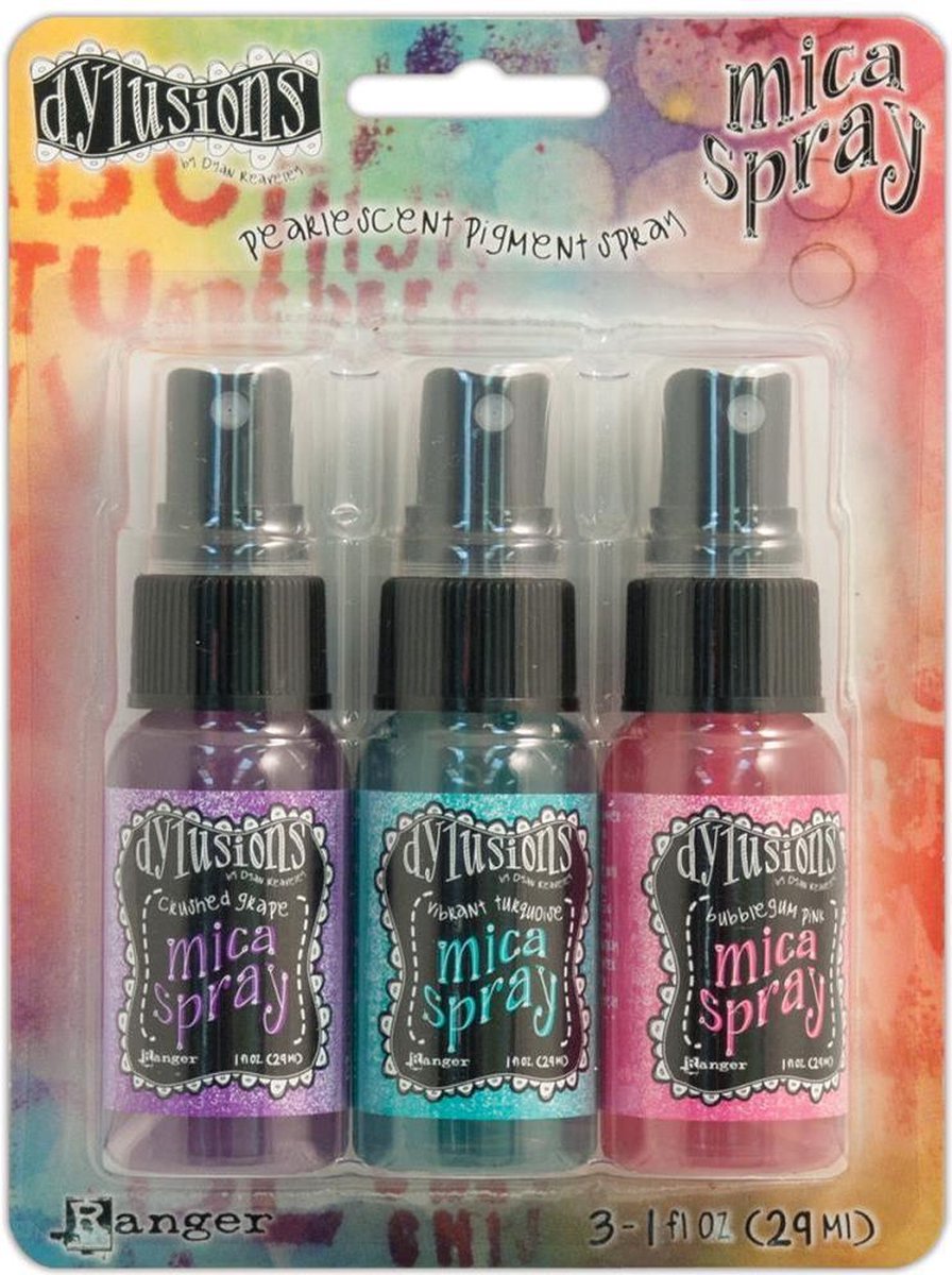 Dylusions-Mica Sprays. Deze sprays kunnen worden gebruikt als een afwerkingsspray of gelaagd over inkten en verven. Sprays hechten op de meeste niet-poreuze oppervlakken, waaronder papier, canvas, hout en stof. Dit pakket bevat drie 29 ml-spuitflessen met mica-spray in drie kleuren. Niet giftig. Zuurvrij.