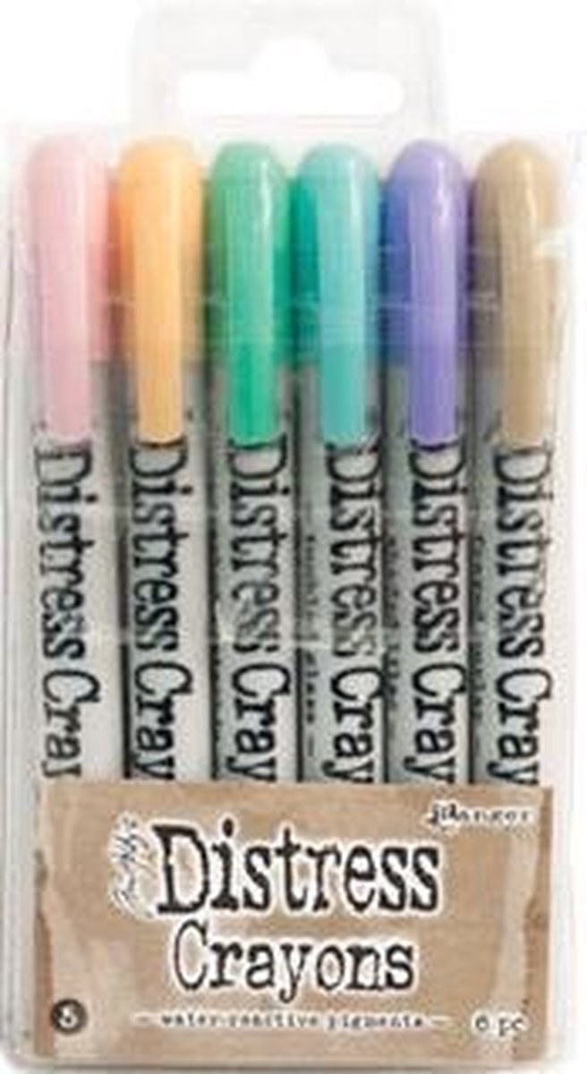 Ranger-Tim Holtz Distress Crayon Set: Set # 1. Deze krijtjes zijn geformuleerd om levendige kleuren effecten op poreuze ondergronden voor mixed media te bereiken. Ideaal voor het maken van schitterende achtergronden, watercoloring, smudge-effecten en nog veel meer! Dit pakket bevat zes 5-1 / 4 inch lang met water reactieve pigment kleurpotloden in diverse kleuren. Niet giftig. Frayed Burlap, Shaded Liliac, Tumbled glass, Cracked Pistachio, dried marigold en spun sugar.