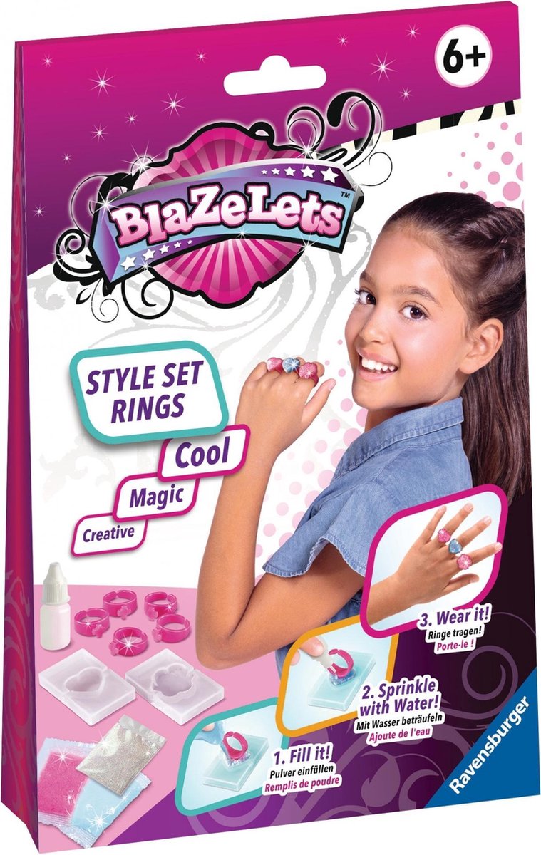 Met de Ravensburger Blazelets Style Set Rings kun je zelf de mooiste ringen maken! Gewoon poeder in de siliconen ring doen, ring erin water erop en klaar is je ring! Inhoud: • 2 siliconen vormen • 5 ringen • 1 waterflesje • 2x poeder in verschillende kleuren • 1x glitter • Handleiding Vanaf 6 jaar.