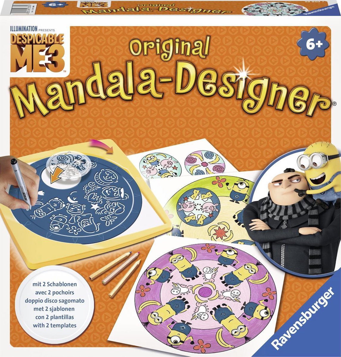 Mandala-Designer® van Ravensburger: gewoon zelf leuke Mandala's schilderen! Met maar één Ravensburger Mandala-Designer®-sjabloon van Despicable Me 3 kan je honderden verschillende mandala's ontwerpen. En met de bijgeleverde potloden kleur je de mandala's vervolgens prachtig in. Gewoon de speciale sjablonen plaatsen en streep voor streep de omtrekken natekenen. Daarna kan de Mandala in verschillende kleuren ingekleurd worden. Zo maak je stap voor stap een zelfgemaakte Mandala. Inhoud: