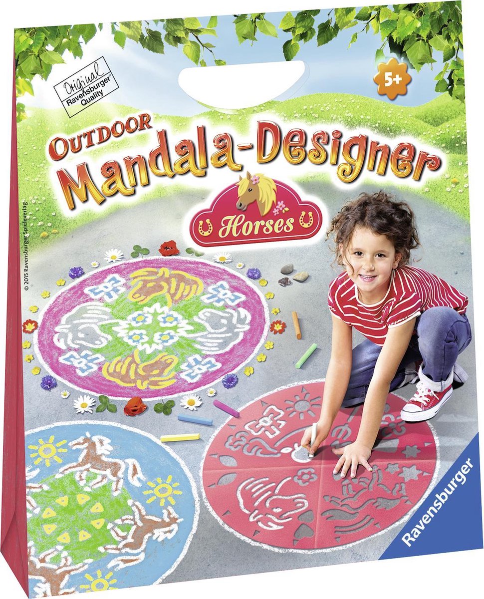 Ravensburger Mandala´s nu ook voor buiten! Wat is er nu leuker dan met mooi weer buiten te tekenen? Met het unieke Ravensburger Mandala-Designer® principe wordt je kind een echte straatkanstenaar – op de stoep-, de straat of op de binnenplaats kunnen de mooiste mandala’s gemaakt worden. De kindervriendelijke samenstelling van het tekengerei wekt nieuwsgierigheid en creativiteit op. De ontwikkeling van concentratie en fijne motoriek worden spelenderwijs bevorderd. Gewoon de sjabloon neerleggen, de juiste krijtjes kiezen en je kant beginnen! Begeleid je kind op een kleurrijke reis in de wereld van de outdoor-mandala’s Horses!