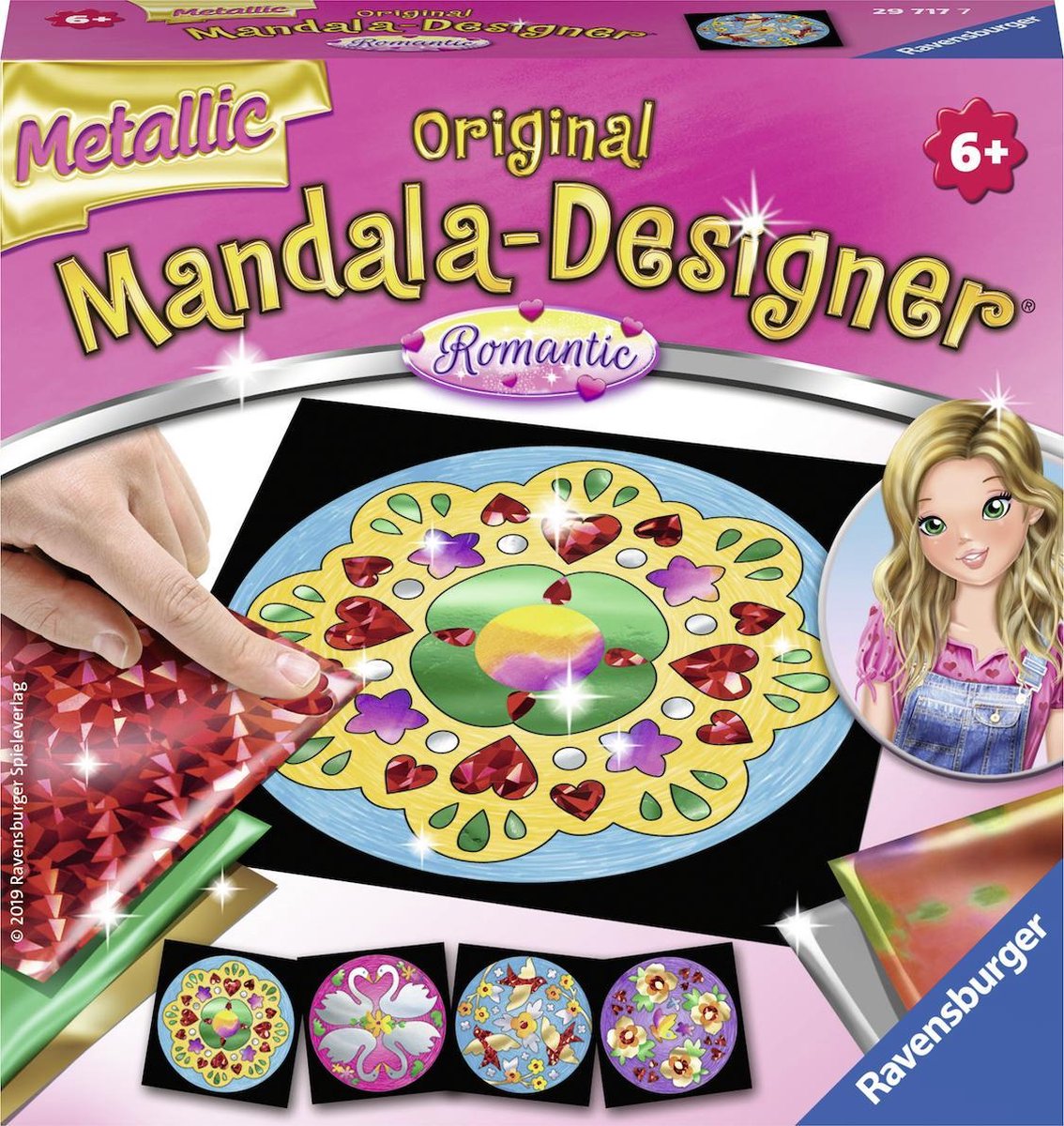 Zelf glitter mandala’s maken! Met de mandala-voorbeelden en de vrolijke metallic folie ontstaan schitterende mandala’s. Gewoon de plakfolie eraf trekken, metallic folie erop leggen, met je vinger eroverheen wrijven en eraf halen.