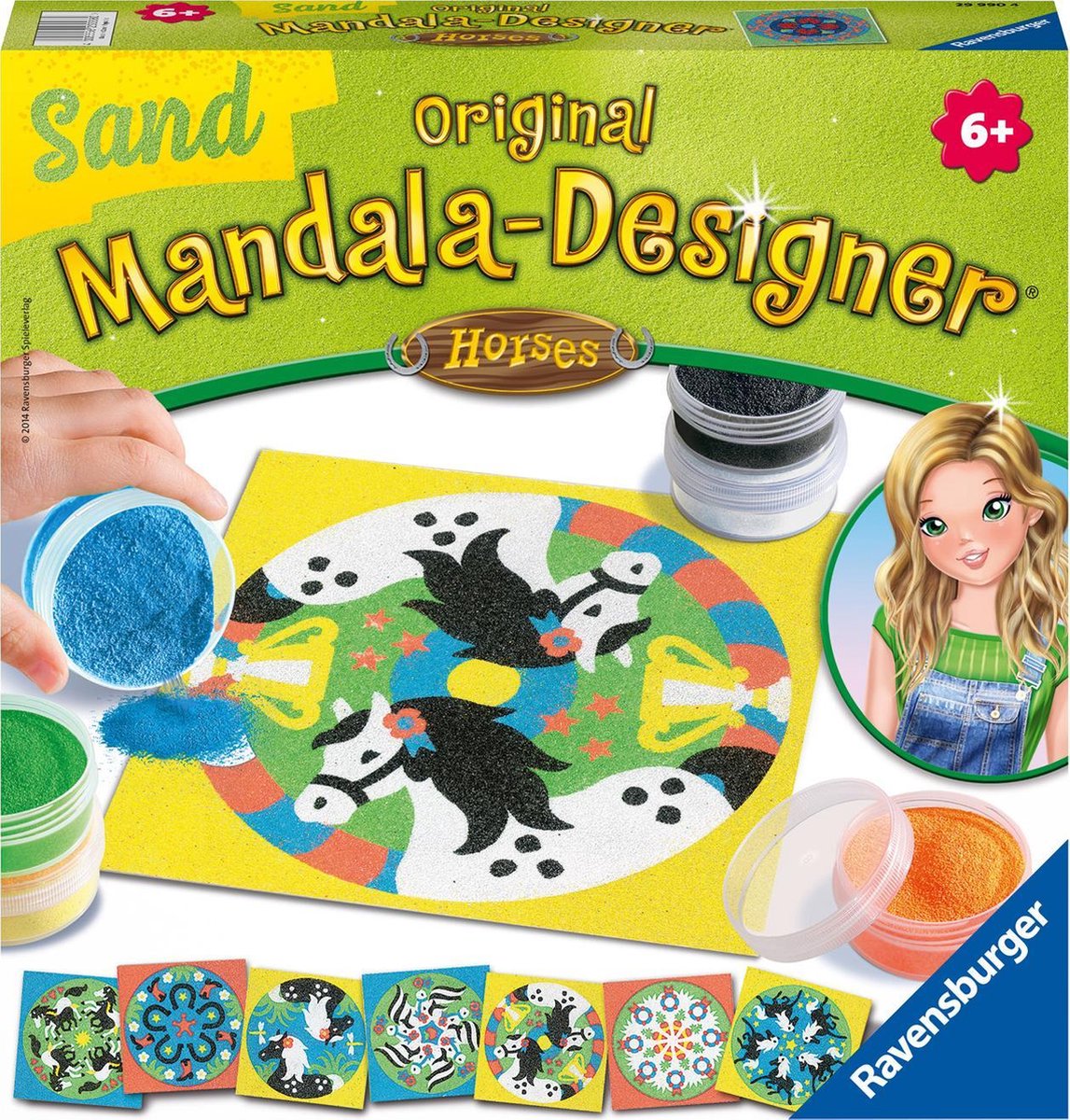 Ben je graag met zand bezig? En hou je van mandala's? Dan is de Mandala-Designer Sand Classic van Ravensburger echt iets voor jou! Met de leuke mandala-sjablonen en de verschillende kleuren zand tover jij de mooiste mandala's tevoorschijn. Supermakkelijk! Elke tekening is opgedeeld in aparte stickertjes. Haal er een stickertje af met het verwijderhulpje, strooi gekleurd zand op deze zone en het zal zich vasthechten op dat stukje. Blaas zacht om het overtollige zand weg te halen. Kies een andere kleur en volg dezelfde stappen tot alles ingekleurd is met zand. Plezier gegarandeerd! Inhoud: 8 mandala-sjablonen 6 potjes zand 1 verwijderhulp 1 doseerlepel 1 handleiding