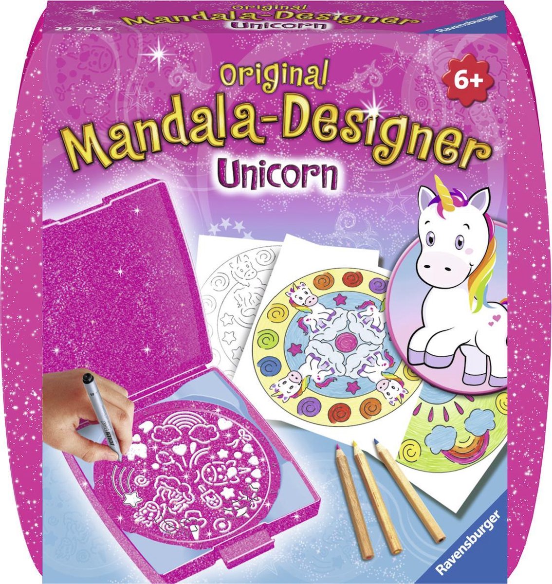 De Ravensburger Mandala-Designer® voor onderweg! Met de Mandala-Designer® unicorn in Mini-formaat kun je onderweg de mooiste mini mandala's ontwerpen. Gewoon het papier inleggen en het sjabloon van pijl naar pijl draaien. Kleur je mandala tot slot mooi in en je zelfontworpen mandala is klaar! Inhoud: Frame Mandala-sjabloon 10 vellen papier 1 viltstift 3 kleurpotloden