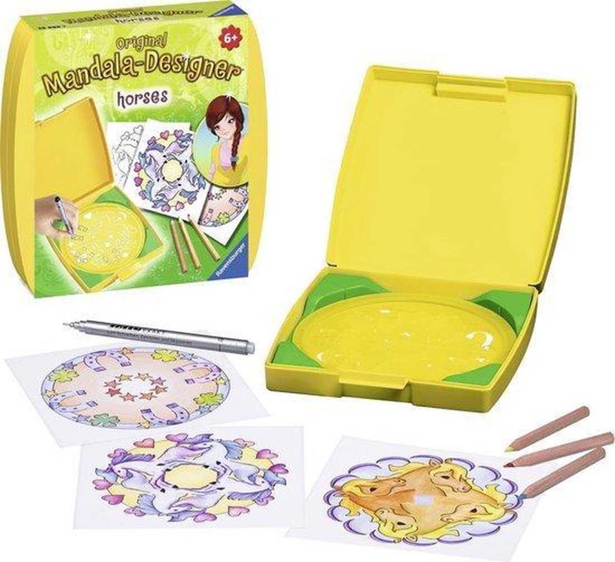 De Ravensburger Mandala-Designer voor onderweg! Met de Mandala-Designer Paarden in Mini-formaat kan je onderweg de mooiste minimandala's ontwerpen. Gewoon het papier inleggen en het sjabloon van pijl naar pijl draaien. Kleur je mandela tot slot mooi in en je zelfontworpen mandala is klaar! Inhoud: Frame Mandala-sjabloon 10 vellen papier Viltstift 3 kleurpotloden