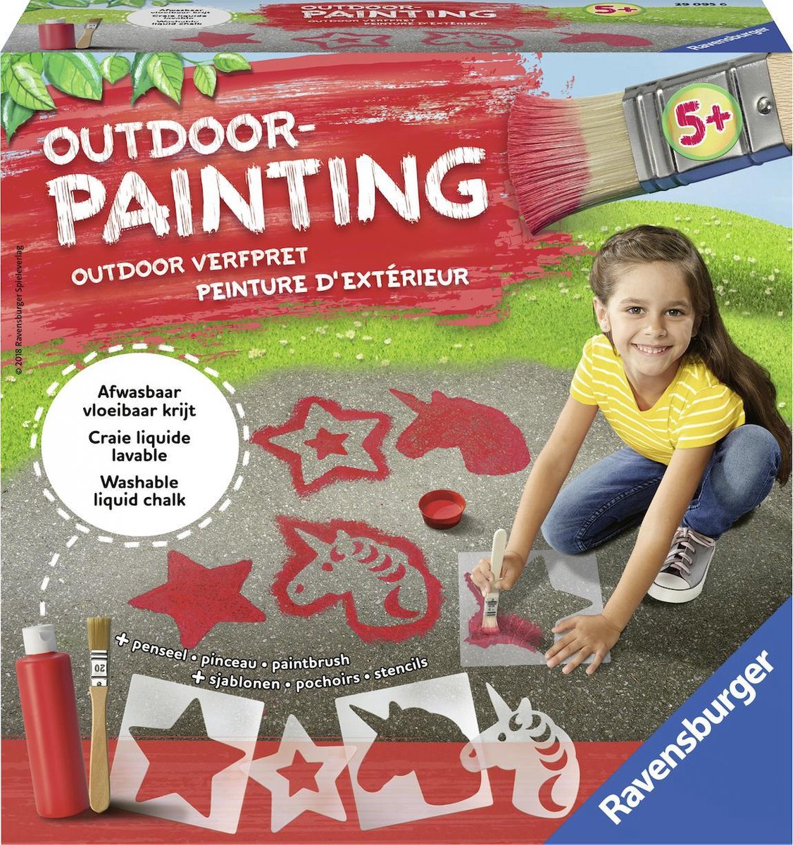Buiten schilderen in het thema Unicorn, met Ravensburger! Outdoor verfpret voor kleine straatkunstenaars! Maak de stoep mooier met behulp van sjablonen of wees creatief en teken vrijuit. Zo ontstaan in de openlucht motieven vol fantasie. Beginnen maar: 1. Neem een van de sjablonen uit de verpakking en maak beide delen van elkaar los. Herhaal dat met de tweede sjabloon. 2. Schud de fles verf goed. Dat is heel belangrijk zodat alles goed gemengd is. Zorg ervoor dat het deksel goed gesloten is. 3. Doe wat verf in de kleine beker. Zo kun je de verf gemakkelijk op je penseel doen en beginnen te verven. 4. Als je met een sjabloon wilt verven, kies je er een uit en leg je die op de straat. Je kan de sjablonen op twee manieren gebruiken: neem ofwel het binnenste deel en ga met het penseel rond de buitenste contour; of neem het buitenste deel van de sjabloon en ga met het penseel langs de binnenkant. 5. Je kunt natuurlijk ook zonder sjabloon leuke kunstwerken op de straat toveren. Steek je