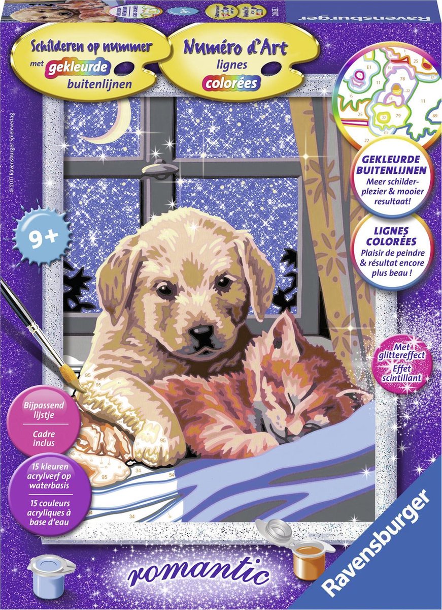 Schilderen op nummer van Ravensburger - iedereen kan schilderen! Dankzij de gekleurde buitenlijnen kunnen kinderen de afbeelding van Goedenacht en de benodigde kleuren sneller herkennen. Zo is het kinderlijk eenvoudig de kunstenaar in jezelf wakker te maken! Met grote schilderoppervlakken en veel verschillende kleuren zijn de schilderplaten van de schilderen op nummer Classic-serie van Ravensburger zeer geschikt voor de jonge kunstenaar. Uitpakken en aan de slag! Onze acrylverf: • droogt snel • is op waterbasis • ruikt niet onaangenaam • maakt penseelreiniger overbodig Inhoud: 15 kleuren acrylverf in hersluitbare potjes penseel voorbeeldblad 1 schilderpaneel 1 lijstje