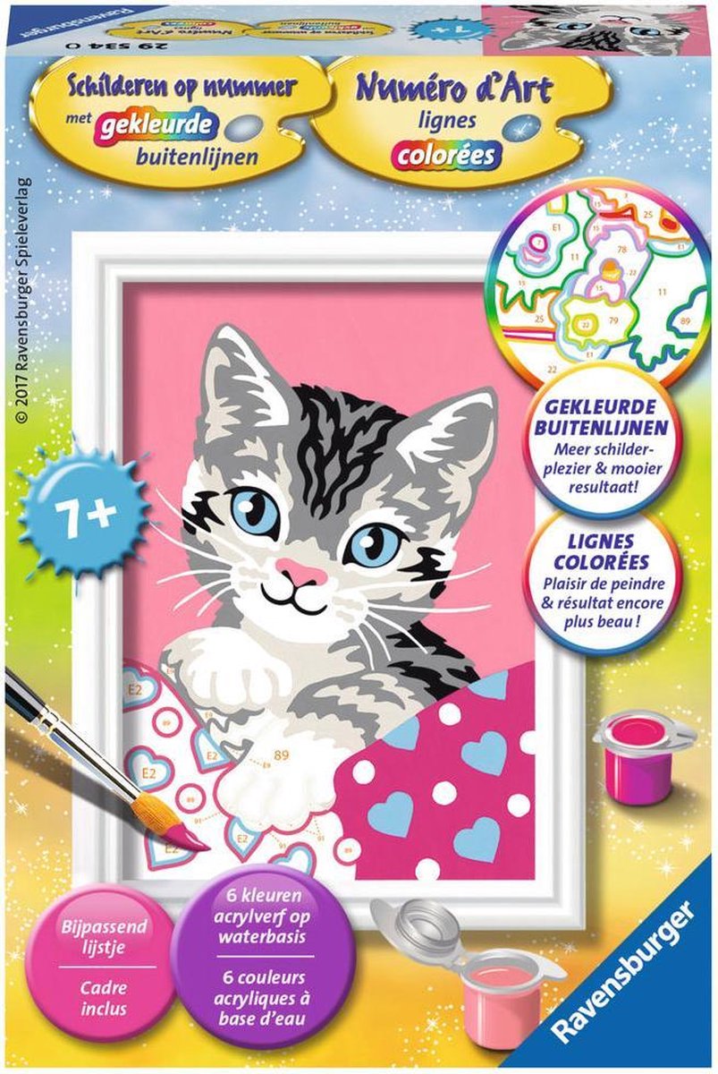 Dankzij de gekleurde buitenlijnen kunnen kinderen de afbeelding van dit schattige poesje en de benodigde kleuren sneller herkennen. Zo lukt het schilderen gegarandeerd! Iedereen Kan Schilderen biedt meer dan een penseel en verf: een geweldige ervaring, een resultaat dat gezien mag worden en blije gezichten. Deze schilderset bevat 6 kleuren acrylverf in hersluitbare potjes, een penseel, voorbeeldblad, schilderpaneel en een lijstje. Alles van hoogwaardig materiaal en afgestemd op de leeftijd van de gebruiker. Eigenschappen van de acrylverf: • droogt snel • is op waterbasis • ruikt niet onaangenaam • maakt penseelreiniger overbodig Afmeting: 8,5 x 12 cm