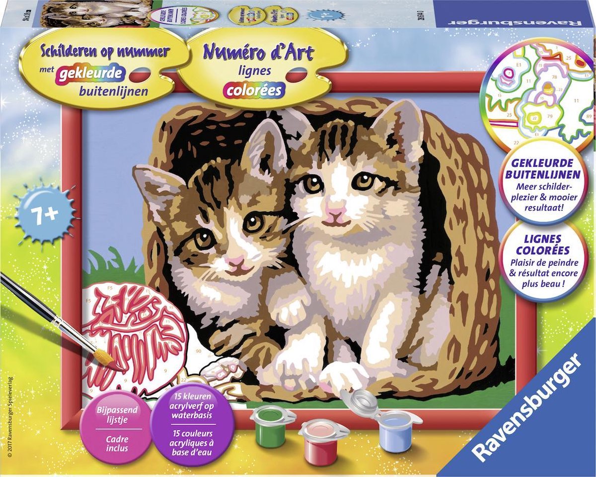 Schilderen op nummer van Ravensburger - iedereen kan schilderen! Dankzij de gekleurde buitenlijnen kunnen kinderen de afbeelding van katjes in een mand en de benodigde kleuren sneller herkennen. Zo is het kinderlijk eenvoudig de kunstenaar in jezelf wakker te maken! Met grote schilderoppervlakken en veel verschillende kleuren zijn de schilderplaten van de schilderen op nummer Classic-serie van Ravensburger zeer geschikt voor de jonge kunstenaar. Uitpakken en aan de slag! Onze acrylverf: • droogt snel • is op waterbasis • ruikt niet onaangenaam • maakt penseelreiniger overbodig Inhoud: 15 kleuren acrylverf in hersluitbare potjes penseel voorbeeldblad 1 schilderpaneel 1 lijstje