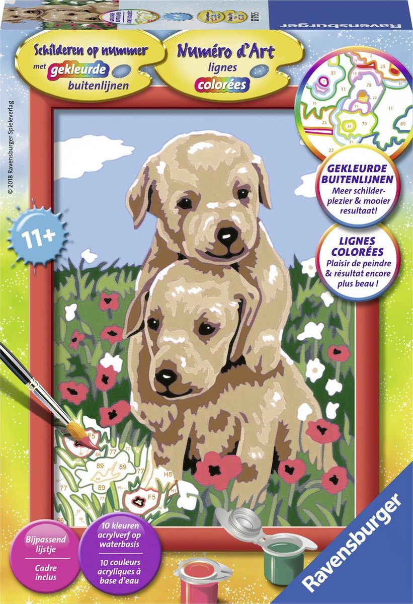 Schilderen op nummer van Ravensburger - iedereen kan schilderen! Dankzij de gekleurde buitenlijnen kunnen kinderen de afbeelding van Knuffelende puppies en de benodigde kleuren sneller herkennen. Zo is het kinderlijk eenvoudig de kunstenaar in jezelf wakker te maken! Met grote schilderoppervlakken en veel verschillende kleuren zijn de schilderplaten van de schilderen op nummer Classic-serie van Ravensburger zeer geschikt voor de jonge kunstenaar. Uitpakken en aan de slag! Onze acrylverf: • droogt snel • is op waterbasis • ruikt niet onaangenaam • maakt penseelreiniger overbodig Inhoud: 10 kleuren acrylverf in hersluitbare potjes, penseel, voorbeeldblad, 1 schilderpaneel en 1 lijstje