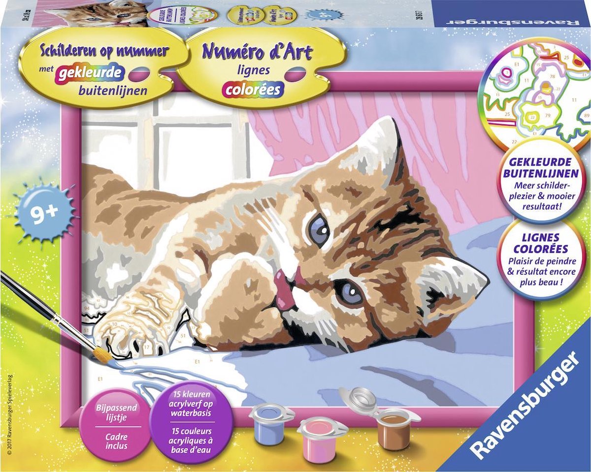 Schilderen op nummer van Ravensburger - iedereen kan schilderen! Dankzij de gekleurde buitenlijnen kunnen kinderen de afbeelding van het knuffelkatje en de benodigde kleuren sneller herkennen. Zo is het kinderlijk eenvoudig de kunstenaar in jezelf wakker te maken! Met grote schilderoppervlakken en veel verschillende kleuren zijn de schilderplaten van de schilderen op nummer Classic-serie van Ravensburger zeer geschikt voor de jonge kunstenaar. Uitpakken en aan de slag! Onze acrylverf: • droogt snel • is op waterbasis • ruikt niet onaangenaam • maakt penseelreiniger overbodig Inhoud: 15 kleuren acrylverf in hersluitbare potjes penseel voorbeeldblad 1 schilderpaneel 1 lijstje