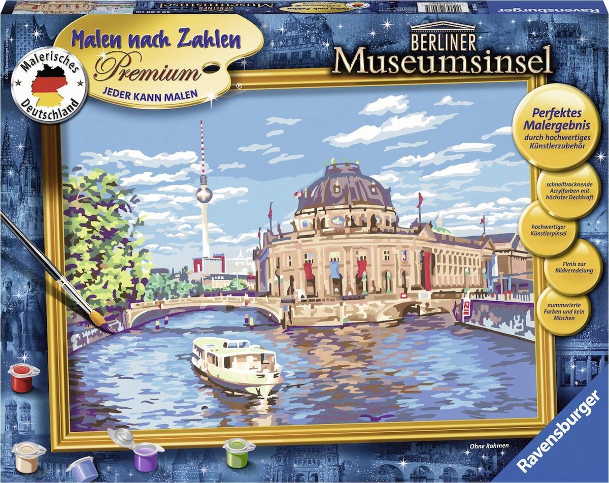 Schilderen op nummer van Ravensburger - iedereen kan schilderen! Dankzij de eenvoudige schildertechniek van schilderen op nummer is het kinderlijk eenvoudig de kunstenaar in jezelf wakker te maken! In de afbeeldingen in de Premium-serie van schilderen op nummer komen romantische werelden tot leven. Wat alle afbeeldingen gemeenschappelijk hebben, is het zachte kleurgebruik en het indrukwekkende schilderoppervlak. Uitpakken en aan de slag, met de afbeelding van museumsingel Berlijn! Inhoud: 1 schilderij + acrylverf + vernis + schilderspalet + penseel. Lijstje niet inbegrepen.