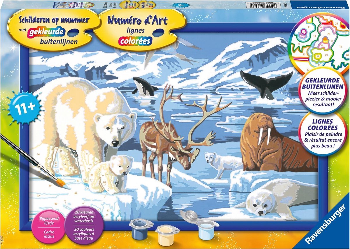 Schilderen op nummer van Ravensburger - iedereen kan schilderen! Gekleurde buitenlijnen: Meer schilderplezier & mooier resultaat! Dankzij de eenvoudige schildertechniek van schilderen op nummer is het kinderlijk eenvoudig de kunstenaar in jezelf wakker te maken. Met de grotere schilderoppervlakken en veel verschillende kleuren zijn de schilderplaten van de schilderen op nummer Classic-serie van Ravensburger zeer geschikt voor de jonge kunstenaar. Uitpakken en aan de slag, met de afbeelding van Op het ijs! Inhoud: 1 schilderij + 20 kleuren acrylverf + vernis + schilderspalet + penseel. Lijstje niet inbegrepen.