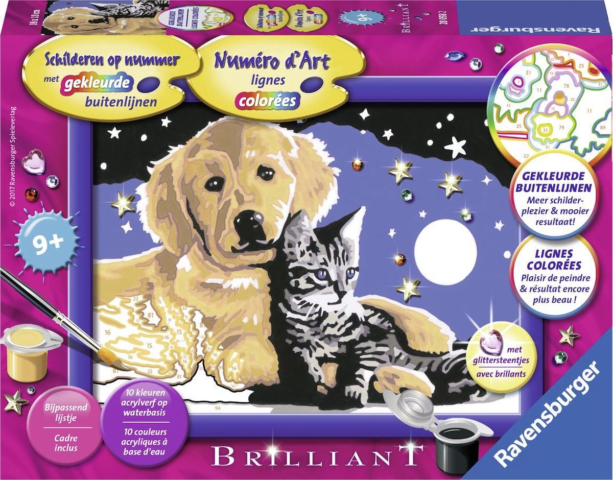 Schilderen op nummer van Ravensburger - iedereen kan schilderen! Dankzij de gekleurde buitenlijnen kunnen kinderen de afbeelding van de schitterende sterrenhemel en de benodigde kleuren sneller herkennen. Zo is het kinderlijk eenvoudig de kunstenaar in jezelf wakker te maken! Met grote schilderoppervlakken en veel verschillende kleuren zijn de schilderplaten van de schilderen op nummer Classic-serie van Ravensburger zeer geschikt voor de jonge kunstenaar. Uitpakken en aan de slag! Onze acrylverf: • droogt snel • is op waterbasis • ruikt niet onaangenaam • maakt penseelreiniger overbodig Inhoud: 10 kleuren acrylverf in hersluitbare potjes, penseel, voorbeeldblad, 1 schilderpaneel en 1 lijstje