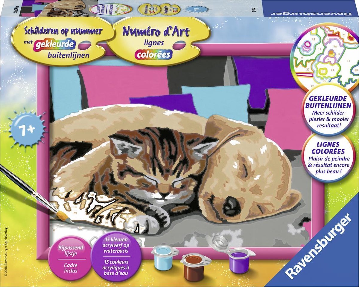 Schilderen op nummer van Ravensburger - iedereen kan schilderen! Dankzij de gekleurde buitenlijnen kunnen kinderen de afbeelding van de Slapende vrienden en de benodigde kleuren sneller herkennen. Zo is het kinderlijk eenvoudig de kunstenaar in jezelf wakker te maken! Met grote schilderoppervlakken en veel verschillende kleuren zijn de schilderplaten van de schilderen op nummer Classic-serie van Ravensburger zeer geschikt voor de jonge kunstenaar. Uitpakken en aan de slag! Onze acrylverf: • droogt snel • is op waterbasis • ruikt niet onaangenaam • maakt penseelreiniger overbodig Inhoud: 15 kleuren acrylverf in hersluitbare potjes, penseel, voorbeeldblad, 1 schilderpaneel en 1 lijstje