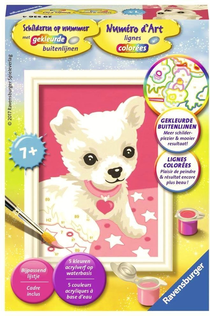 Dankzij de gekleurde buitenlijnen kunnen kinderen de afbeelding van de chihuahua en de benodigde kleuren sneller herkennen. Zo lukt het schilderen gegarandeerd! Deze schilderset bevat 5 kleuren acrylverf in hersluitbare potjes, een penseel, voorbeeldblad, schilderpaneel en een lijstje. Alles van hoogwaardig materiaal en afgestemd op de leeftijd van de gebruiker. Onze acrylverf: • droogt snel • is op waterbasis • ruikt niet onaangenaam • maakt penseelreiniger overbodig Inhoud: 5 kleuren acrylverf in hersluitbare potjes penseel voorbeeldblad 1 schilderpaneel 1 lijstje