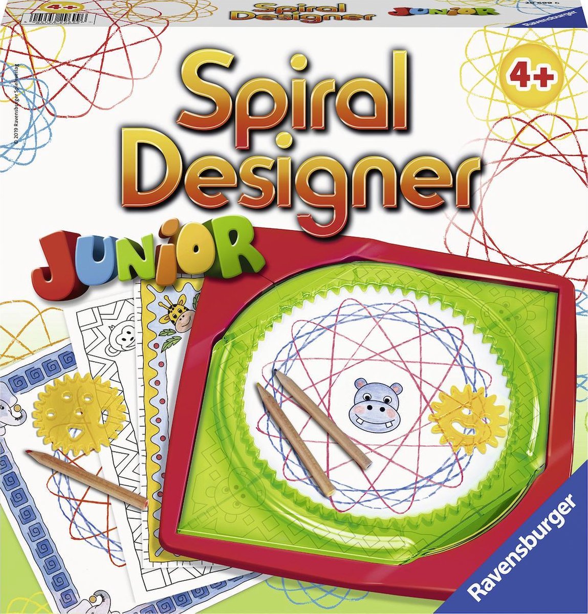 Kleine kunstenaars vanaf 4 jaar kunnen al prachtige, kleurrijke spiraal afbeeldingen tekenen met de Junior Spiral Designer. Gewoon papier inleggen, potlood in één van de beide tandwielen steken en langs de tandkrans gaan. Dankzij het kindvriendelijke materiaal is het heel eenvoudig. De randen met patronen en de dierenkoppen op de voorgedrukte bladen zorgen bovendien voor nog meer tekenpret! Inhoud: 1 tekenraam 1 tandkrans 2 tandwielen 3 kleurpotloden 5 witte vellen papier 5 bedrukte vellen papier handleiding