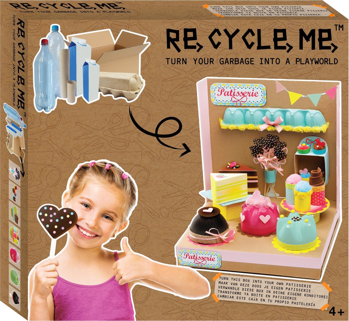 "Met dit knutselpakket van Re-Cycle-Me knutselen kinderen hun eigen Patisserie van afval. Je knutselt je eigen cupcakes en taartjes. De geknutselde Patisserie is daarna goed voor urenlang speelplezier. Dit knutselpakket bevat verschillende componenten om mee te knutselen en zelfs de verpakking wordt gebruikt in de creatie!