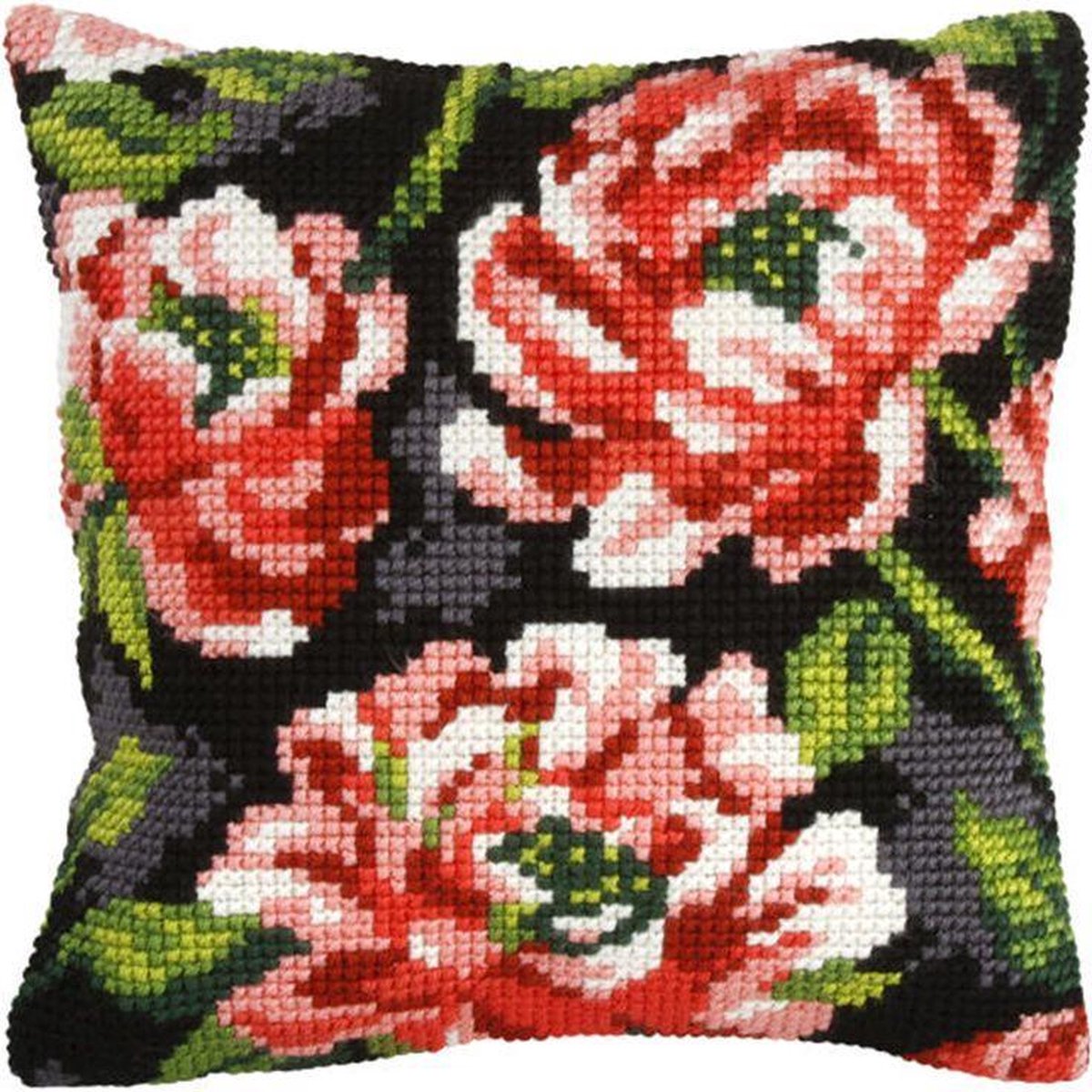 Kruissteekkit Grof stramien: 100% katoen Dik garen: 100% acryl 18 steken/10 cm Werkwijze in meerdere talen Naald Foto ca. 40 x 40 cm / 16" x 16" Leeftijdscategorie: vanaf 6 jaar Steken: kruissteek