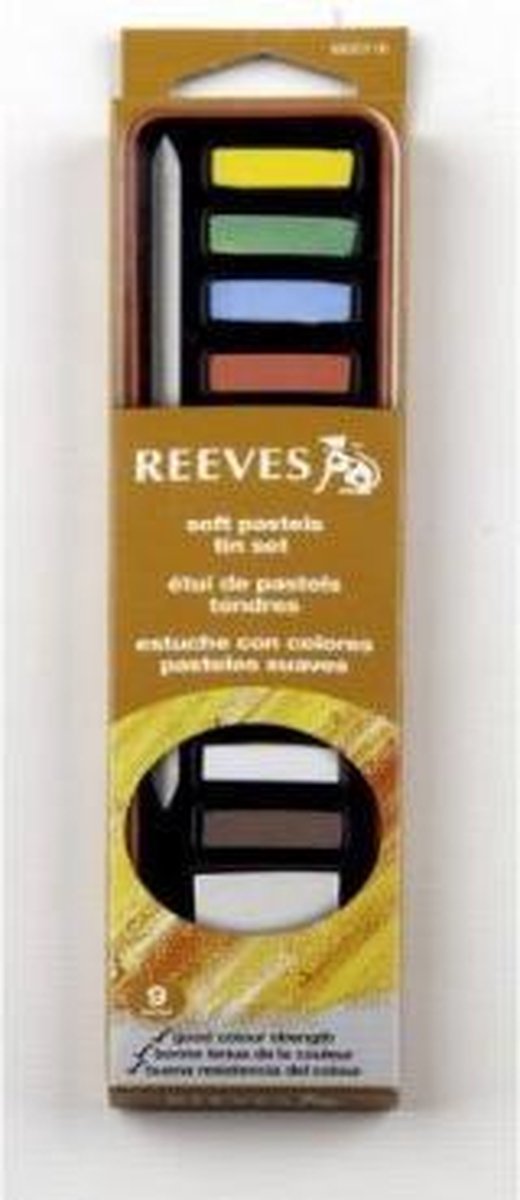Inhoud van afsluitbaar blik 7 kleuren Reeves softpastel krijt 1 Kneetgum 1 Doezelaar