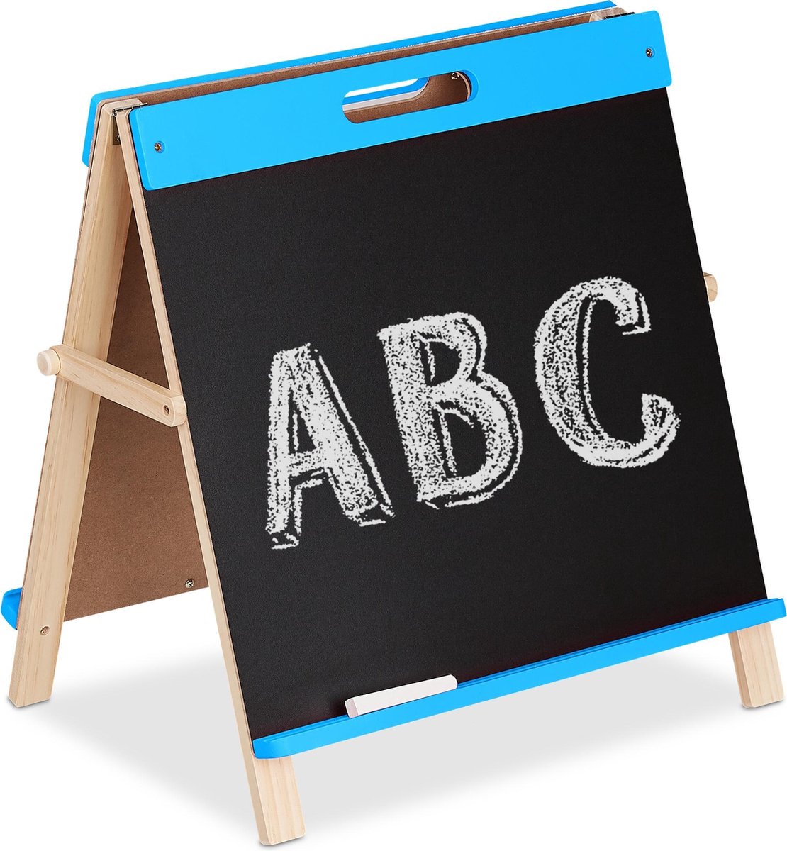 Bevorder de creativiteit en leergierigheid van je kind met dit dubbelzijdige tekenbord voor kinderen. Het blauwe krijtbord kan op tafel worden geplaatst en vervolgens aan beide kanten met krijt erop geschreven worden. Ook om te kleuren, tekenen en rekenen biedt het dubbelzijdige schoolbord voor kinderen genoeg ruimte. Bij niet gebruik is het krijtbord binnen handomdraai compact ingeklapt en dankzij de greep is hij eenvoudig te dragen. Krijtbord in detail - Afmeting H x B x D: ca. 48,5 x 48 x 36 cm - Ingeklapt H x B x D: ca. 50 x 46 x 9,5 cm - Oppervlakte bord H x B: 37,5 x 44 cm - Gewicht: ca. 1,9 kg - Materiaal: Grenen - Kleur: Blauw Schoolbord voor kinderen - Om te rekenen en schrijven, tekenen en kleuren - Geschikt voor normale krijtjes - Gewoon op tafel of op de grond plaatsen - Met plankje voor krijtjes en greep om te dragen - Kan ingeklapt en compact worden opgeborgen - Met frame en plankje in blauw leuk voor jongens Levering omvat - 1 x houten krijtbord - Decoratie is bij de