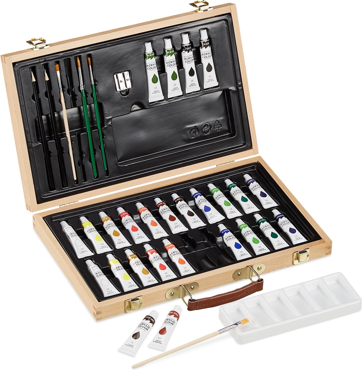 De hoogwaardige tekendoos van hout bevat diverse kunstenaarsbenodigdheden om de wereld van het schilderen en tekenen te ontdekken en is daarom ook een leuk cadeau. Met de twee potloden in 2 hardheidsgraden kun je eerste schetsen maken en de dubbele puntenslijper zorgt voor een optimale toestand van je potloden. De acrylverf kan in het palet naar wens gemengd worden en met de verschillende penselen direct op het papier of het schildersdoek worden aangebracht. Creëer zo je eigen meesterwerk. Tekendoos van hout in detail - Afmeting H x B x D: ca. 5 x 37 x 27,5 cm - Uitgeklapt grootte H x B x D: ca. 2,5 x 37 x 48,5 cm - Gewicht: ca. 1,2 kg - Materiaal: Beukenhout - Kleur: Natuur 35-delige tekenset voor beginners - Potloden H x D: ca. 17,5 x 0,7 cm - Potloden met hardheid van: B, HB - Puntenslijper H x B x D: ca. 1,5 x 2,5 x 2,5 cm - Penseel H: ca. 16,5-18 cm - Volume van een tube: ca. 12 ml - Mengpalet H x B x D: ca. 1,5 x 19 x 7 cm Tekenkoffer voor een creatieve tijd - Bevat alle