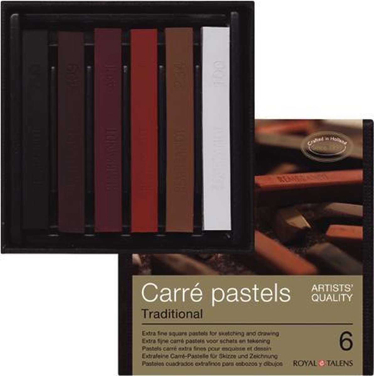 Carré pastels • Hoge kleurafgifte en kleurkracht • Extra stevigheid, waardoor ze niet zo breekbaar zijn en weinig stof afgegeven • Zeer krachtige en zuivere kleuren • Verwasbaar • De hoogst mogelijke graad van lichtechtheid • Een goede hechting op vrijwel alle papiersoorten