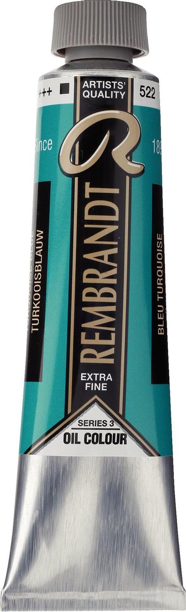 De professionele olieverf van Rembrandt is een superieure verf die met zorg in Nederland wordt samengesteld uit de beste grondstoffen. Het assortiment bestaat uit levendige, intense kleuren in elke gewenste dekkingsgraad. De fijngemalen pigmenten zijn zeer geconcentreerd voor optimale kleurkracht. Rembrandt verf biedt de hoogste lichtechtheids- en duurzaamheidsgraad. Turkooisblauw (522). Tube 40 ml.