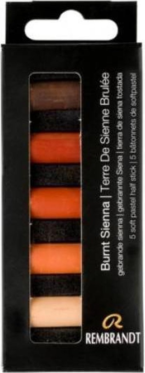 Nieuw! Themasets van Rembrandt softpastels, de meest gebruikte pastels ter wereld. Ze zijn heel zacht en geven makkelijk kleur af. De kleuren zijn zuiver en briljant en ook nog eens uitstekend lichtecht. Je pasteltekening blijft, ook na vele jaren, net zo mooi als op de dag dat jij het maakte. Pastel is een zachte krijtsoort op basis van kaolien (porseleinaarde) en pigment, waarmee op schilderachtige wijze getekend kan worden. Kunstenaars die met pastelkrijt werken zien hun werk eerder als een schilderij dan als een tekening. Als je het woord pastel hoort, denk je al snel aan pasteltinten, maar pastels zijn ook verkrijgbaar in zeer felle kleuren. In deze set vind je 5 halve pastels in een palet van gebrande sienna. 411.3 Gebrande sienna 411.5 Gebrande sienna 411.7 Gebrande sienna 411.8 Gebrande sienna 411.9 Gebrande sienna