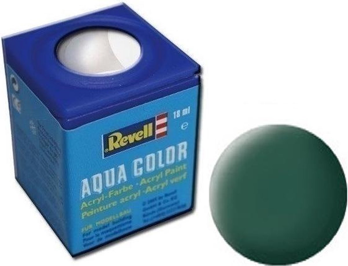 Revell Aqua Color waterverf Revell Aqua Color is met water verdunbare verf met hoge dekking! Milieuvriendelijk, vrijwel reukloos en niet brandbaar! Reeds na een uur kan over de drogende verf heen worden geschilderd. De verf is na twee tot drie uur door en door droog. De diverse kleuren kunnen met elkaar worden gemengd en zijn alleen met water te verdunnen. Met deze modelbouwverf kunnen buitengewoon gladde kleurvlakken gerealiseerd worden. Voor airbrushing wordt de verf met hoogstens 20 tot 25% water verdund. Specificaties: Geslacht: unisex Kleur: donkergroen mat Leeftijd: vanaf 12 jaar Materiaal: metaal, verf Inhoud: 18 ml