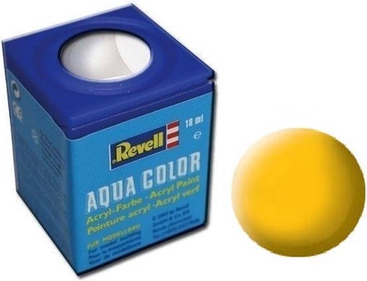 Revell Aqua Color waterverf Revell Aqua Color is met water verdunbare verf met hoge dekking! Milieuvriendelijk, vrijwel reukloos en niet brandbaar! Reeds na een uur kan over de drogende verf heen worden geschilderd. De verf is na twee tot drie uur door en door droog. De diverse kleuren kunnen met elkaar worden gemengd en zijn alleen met water te verdunnen. Met deze modelbouwverf kunnen buitengewoon gladde kleurvlakken gerealiseerd worden. Voor airbrushing wordt de verf met hoogstens 20 tot 25% water verdund. Specificaties: Geslacht: unisex Kleur: geel mat Leeftijd: vanaf 12 jaar Materiaal: metaal, verf Inhoud: 18 ml