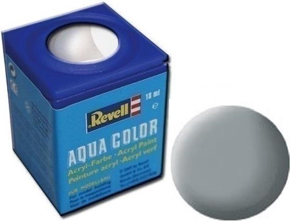 Revell Aqua Color waterverf Revell Aqua Color is met water verdunbare verf met hoge dekking! Milieuvriendelijk, vrijwel reukloos en niet brandbaar! Reeds na een uur kan over de drogende verf heen worden geschilderd. De verf is na twee tot drie uur door en door droog. De diverse kleuren kunnen met elkaar worden gemengd en zijn alleen met water te verdunnen. Met deze modelbouwverf kunnen buitengewoon gladde kleurvlakken gerealiseerd worden. Voor airbrushing wordt de verf met hoogstens 20 tot 25% water verdund. Specificaties: Geslacht: unisex Kleur: helgrijs mat Leeftijd: vanaf 12 jaar Materiaal: metaal, verf Inhoud: 18 ml