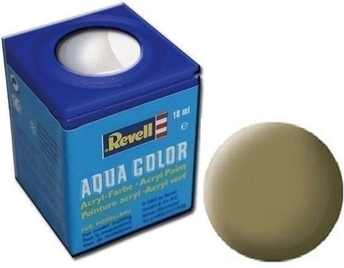 Revell Aqua Color waterverf Revell Aqua Color is met water verdunbare verf met hoge dekking! Milieuvriendelijk, vrijwel reukloos en niet brandbaar! Reeds na een uur kan over de drogende verf heen worden geschilderd. De verf is na twee tot drie uur door en door droog. De diverse kleuren kunnen met elkaar worden gemengd en zijn alleen met water te verdunnen. Met deze modelbouwverf kunnen buitengewoon gladde kleurvlakken gerealiseerd worden. Voor airbrushing wordt de verf met hoogstens 20 tot 25% water verdund. Specificaties: Geslacht: unisex Kleur: kakibruin mat Leeftijd: vanaf 12 jaar Materiaal: metaal, verf Inhoud: 18 ml
