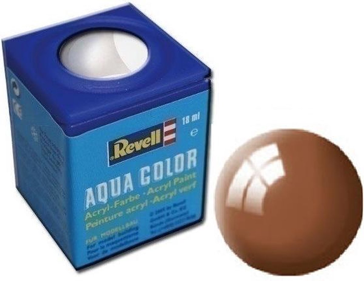 Revell Aqua Color waterverf Revell Aqua Color is met water verdunbare verf met hoge dekking! Milieuvriendelijk, vrijwel reukloos en niet brandbaar! Reeds na een uur kan over de drogende verf heen worden geschilderd. De verf is na twee tot drie uur door en door droog. De diverse kleuren kunnen met elkaar worden gemengd en zijn alleen met water te verdunnen. Met deze modelbouwverf kunnen buitengewoon gladde kleurvlakken gerealiseerd worden. Voor airbrushing wordt de verf met hoogstens 20 tot 25% water verdund. Specificaties: Geslacht: unisex Kleur: kleibruin glanzend Leeftijd: vanaf 12 jaar Materiaal: metaal, verf Inhoud: 18 ml