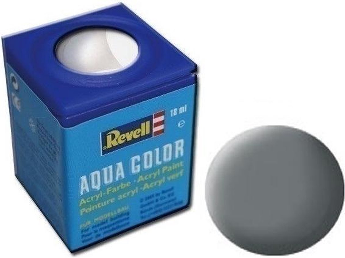 Revell Aqua Color waterverf Revell Aqua Color is met water verdunbare verf met hoge dekking! Milieuvriendelijk, vrijwel reukloos en niet brandbaar! Reeds na een uur kan over de drogende verf heen worden geschilderd. De verf is na twee tot drie uur door en door droog. De diverse kleuren kunnen met elkaar worden gemengd en zijn alleen met water te verdunnen. Met deze modelbouwverf kunnen buitengewoon gladde kleurvlakken gerealiseerd worden. Voor airbrushing wordt de verf met hoogstens 20 tot 25% water verdund. Specificaties: Geslacht: unisex Kleur: muisgrijs mat Leeftijd: vanaf 12 jaar Materiaal: metaal, verf Inhoud: 18 ml