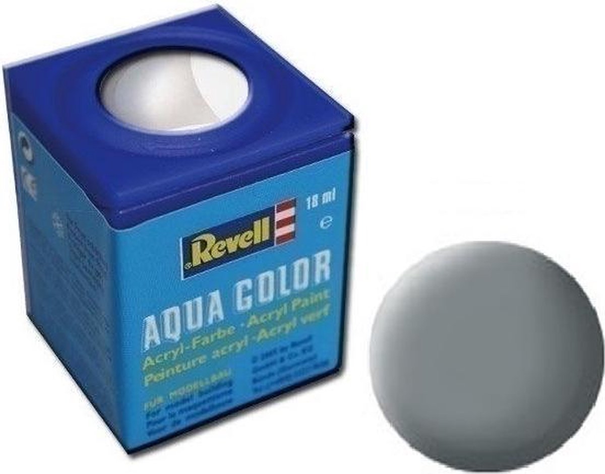 Revell Aqua Color waterverf Revell Aqua Color is met water verdunbare verf met hoge dekking! Milieuvriendelijk, vrijwel reukloos en niet brandbaar! Reeds na een uur kan over de drogende verf heen worden geschilderd. De verf is na twee tot drie uur door en door droog. De diverse kleuren kunnen met elkaar worden gemengd en zijn alleen met water te verdunnen. Met deze modelbouwverf kunnen buitengewoon gladde kleurvlakken gerealiseerd worden. Voor airbrushing wordt de verf met hoogstens 20 tot 25% water verdund. Specificaties: Geslacht: unisex Kleur: zilvergrijs mat Leeftijd: vanaf 12 jaar Materiaal: metaal, verf Inhoud: 18 ml