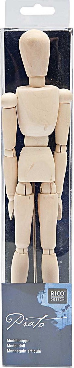 Prachtige houten tekenmodel van Rico Design. De tekenpop is eenvoudig in verschillende houdingen te draaien door de beweegbare gewrichten en biedt elke kunstenaar oneindige pose variaties. De tekenpop dient dan ook perfect als model tijdens het schilderen en tekenen. DETAILS: Gemaakt van hout en gemonteerd op een standaard voor stabiliteit. Afmeting: 32.5 x 9 x 6.5 CM Thema: Piato Series