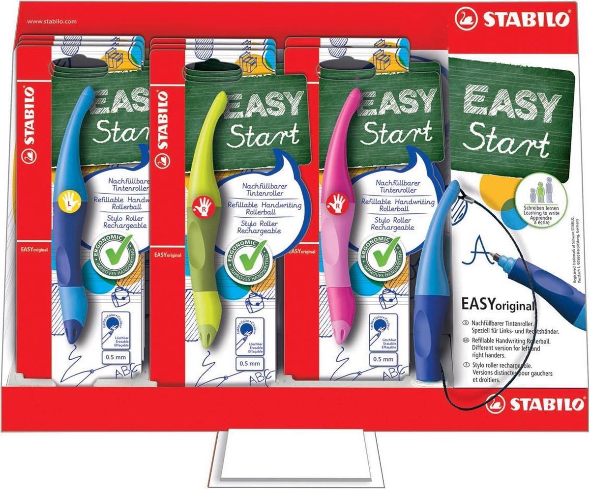 Roller met uitwisbare blauwe inkt. Schrijfbreedte 0,5 mm. Gemakkelijk om te leren schrijven. Met een ergonomische rubberen grip. Geventileerde dop. Navulbaar. Op blister. display van 9 stuks: 2 x linkshandig en 7 x rechtshandig, met blauwe testroller en testblok