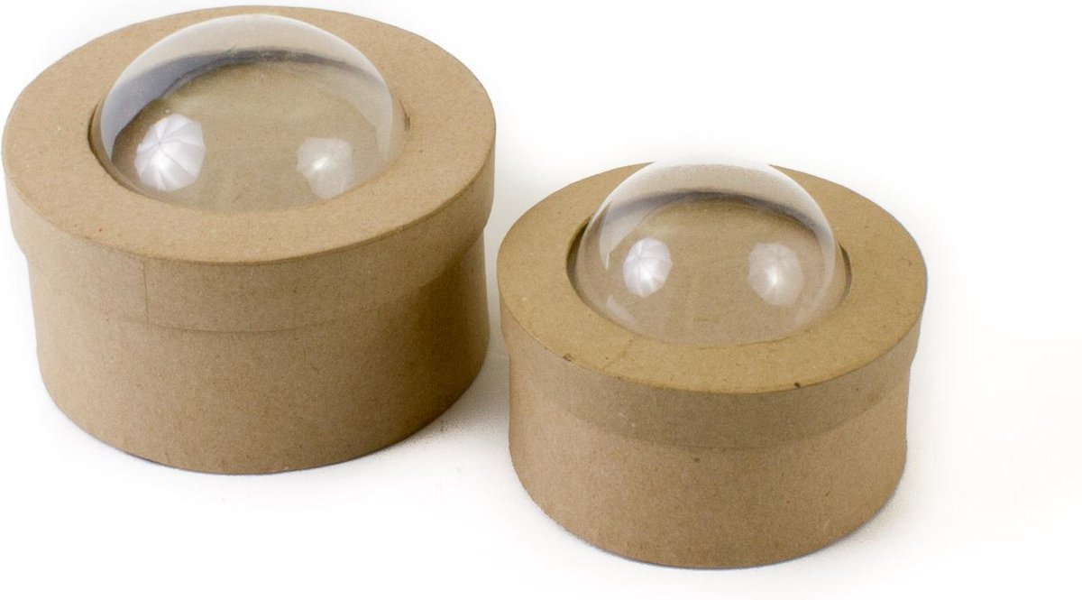 Zeer fraaie blisterdozen voor mooie creatieve projecten. Voor het maken van een persoonlijk memorie doosje. Worden geleverd in 2 verschillende maten. De grootste doos is 15cm in doorsnee en zonder stolp 8cm hoog. De doorzichtige stolp is 9cm doosnee en 3cm hoog. De kleine doos is 12cm in doornee en 6,5cm hoog. De stolp is 7cm doorsnee en 2,5cm hoog.Je kunt er een zeer persoonlijk doosje van maken door onder de stolp kleine spulletjes te plaatsen zolas fot, kleine miniaturen, bloemetjes, hondje of poesje, een diploma of ander document.