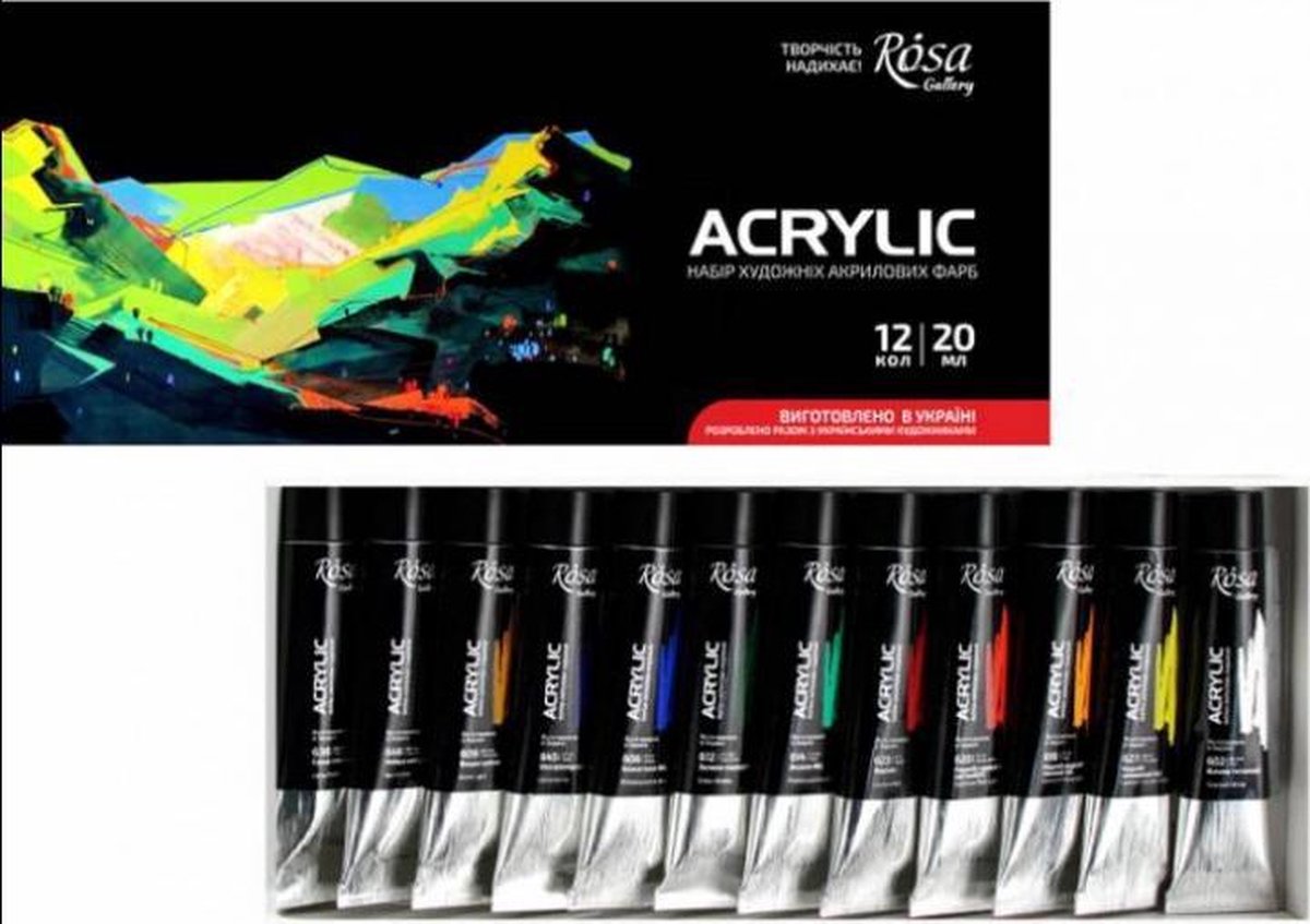 Set met goede kwaliteit acrylverf in briljante kleuren met een satijn glans die te mixen zijn met andere kleuren acrylverf. Deze nieuwe acrylverf uit Oekraïne doet niet onder voor de bekende merken. Watervast wanneer deze compleet opgedroogd is.