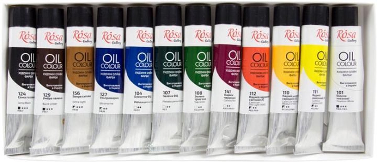 Set met goede kwaliteit olieverf in briljante kleuren. Deze nieuwe olieverf uit Oekraïne doet niet onder voor de bekende merken. Watervast wanneer deze compleet opgedroogd is. Set met 12 verschilende kleuren