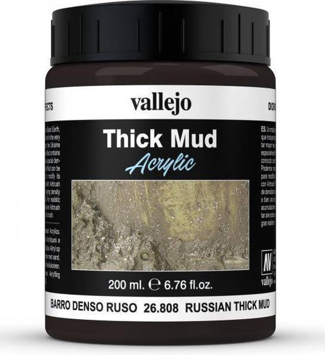 Vallejo Russian Mud Thick Mud Weathering Effects contains 200ml Russian Mud Thick Mud. A familiar shade known as Black Earth, especially dark and dense, found in the fertile soil of Eastern Europe, Ukraine and southern Russia. Contains traces of vegetation which ad a special dense and realistic texture. The range consists of 6 products with a heavy and thick consistency and a slightly glossy finish, ideal for reproducing terrain on vignettes or dioramas, as well as for texture on wheels and the lower part of vehicles, the chains of armored cars and accumulations of mud on the tracks. The remains of vegetation included in some of the references provide an especially realistic texture to the final aspect of the model.