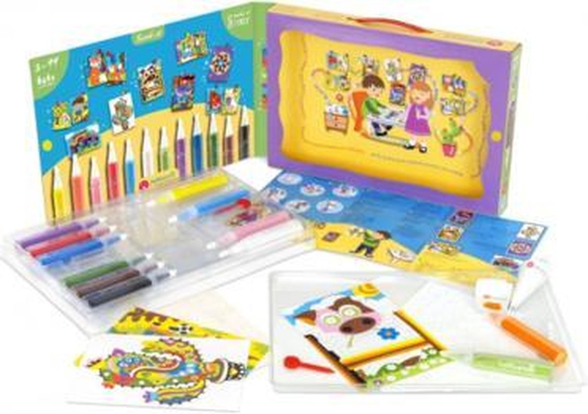 Inhoud: -12 gekleurde zandpennen -12 voorgedrukte tekeningen op zelfklevend papier -1 set schep en trechter -2 tools.