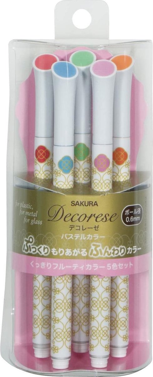 Sakura Decorese DB206P5A: Deze pennen van Sakura hebben een prachtige heldere inkt dat perfect werkt op vrijwel alle oppervlakken zoals Papier, Photo's, Plastic, Glas, en Metaal. De op water gebaseerde pigment gel inkt produceert een verf-achtige textuur op het schrijf oppervlak, en wanneer droog blijft de prachtige kleur op zijn plek ookal wrijf je er overheen ! De mooie vormgegeven behuizing lijkt bijna mooie duure cosmetica. Elke pen laat de pen kleuren zien en de mooie vorm zorgt dat de pen niet rolt. Deze set bevat 5 kleuren : Pastel Blue, Pastel Mint, Pastel Orange, Pastel Pink, Pastel Red Punt dikte : 0,6mm Voor 15:00 besteld vandaag verzonden.