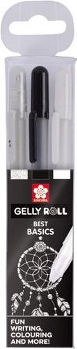 Set met 3 gelpennen Basic zwart, Basic wit en Stardust transparant. Geweldig om mee te tekenen, versieren en schrijven. Te gebruiken voor handlettering, bullet journaling, (wens)kaarten en nog veel meer! Gelly Roll In 1984 vond Sakura een nieuw soort inkt uit, gebaseerd op gel en die in veel prachtige kleuren gemaakt kon worden. De wereld maakte voor het eerst kennis met de gelpen, genaamd Gelly Roll, die sindsdien bekend is geworden om haar prachtige schrijfresultaat waarbij je niet hoeft te drukken. Het schrijft heerlijk en ligt soepel in de hand. Inmiddels bestaat Gelly Roll in veel soorten kleuren en effecten zoals Stardust (glitter), Metallic (glanzend) en Moonlight (fluorescerend). Superleuk voor het beschrijven van wenskaarten, maar ook voor tekenen en decoreren.